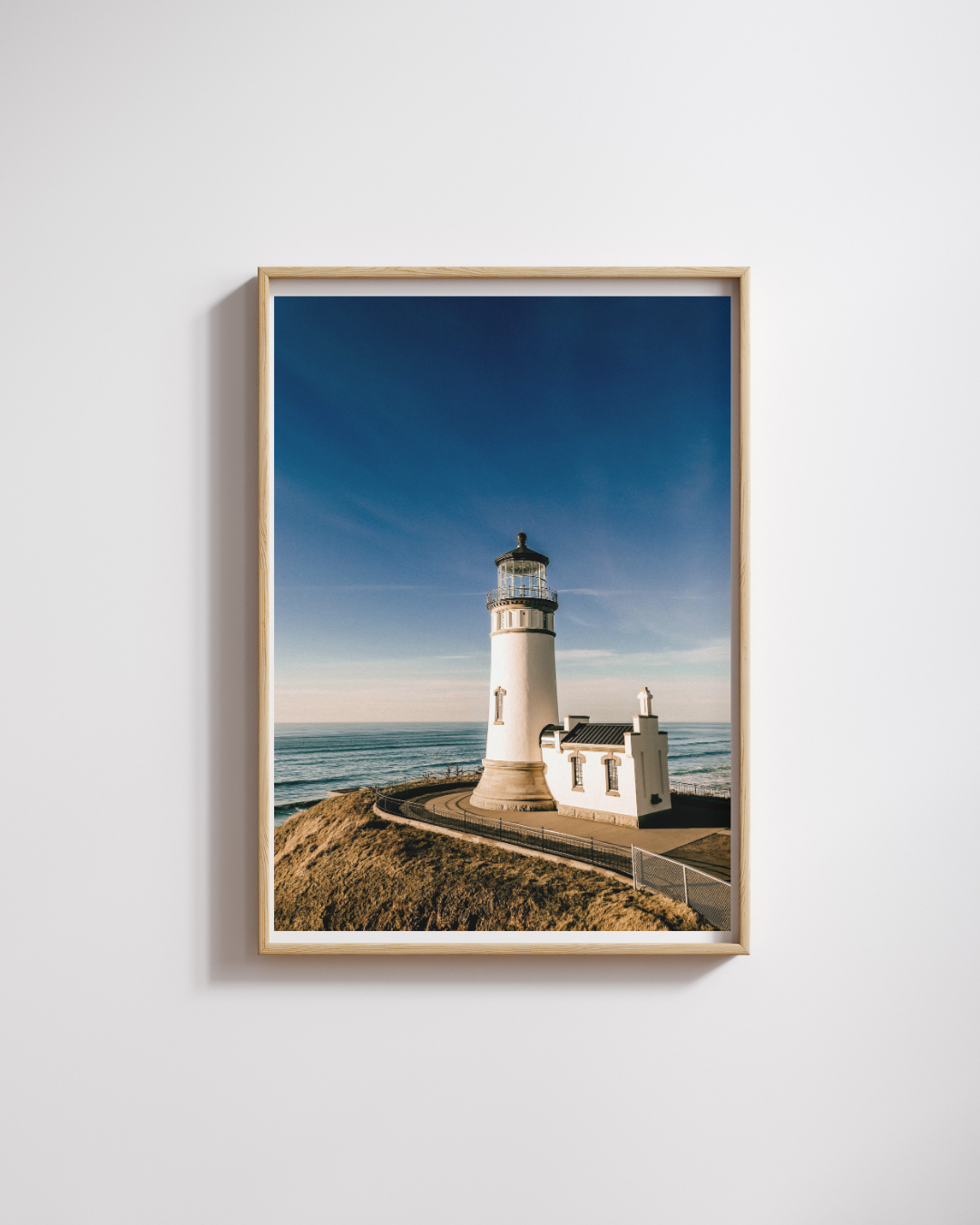 This vertical print captures Yaquina Head Lighthouse standing tall over the Oregon Coast, where cliffs drop to sea and sky stretches wide. Timeless and steady, this image is perfect for coastal lovers and those who find peace in strong, quiet places.